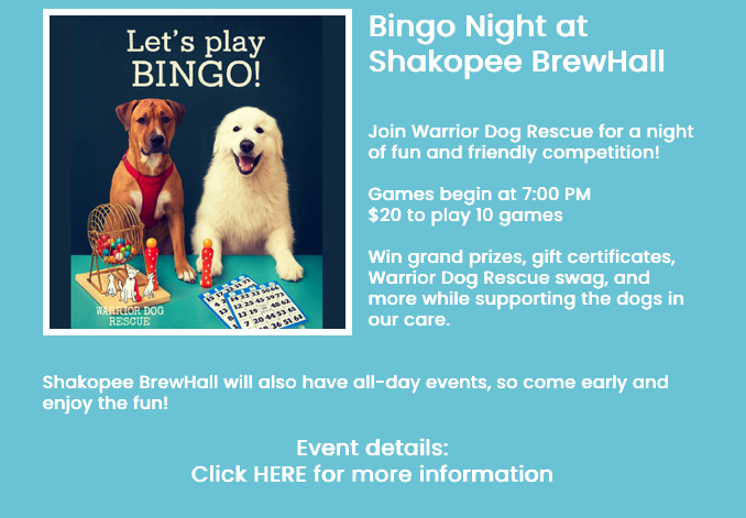 Warrior Dog rescue is a non-profit organization based in Savage, MN dedicated to rescuing, rehabilitating, and finding adoptive homes for dogs that have been abandoned, abused, or neglected. We are celebrating our 8th year in rescue and have saved over 3,200 dogs.